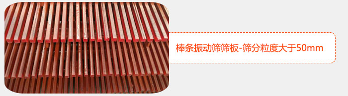 棒條振動篩篩板是由一組平行排列的、具有一定斷面形狀的鋼棒組成。棒條平行排列,棒條之間的間隔即為篩孔尺寸。棒條篩面一般用于固定篩或重型振動篩,適于篩分粒度大于50mm的粗粒級物料。