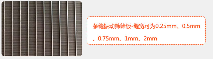 條縫振動篩篩板用不銹鋼作篩條制成,有穿條式、焊接式和編織式三種結構型式。條縫振動篩篩板的篩條斷面形狀為圓形,縫寬可為0.25mm、0.5mm、0.75mm、1mm、2mm等。條縫振動篩篩板適用于對中細粒級的脫水、脫介和脫泥作業。